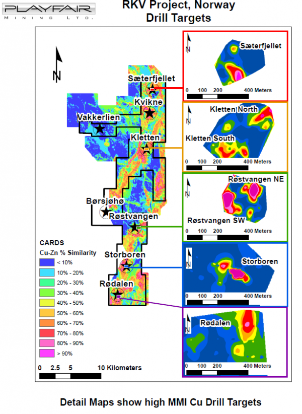 Playfair’s extensive drill program on its large (201 square kilometers) 100% owned RKV Copper Project in South Central Norway to test targets identified by using a combination of Artificial Intelligence (CARDS) and Mobile Metal Ion (MMI) geochemistry was partially completed in late 2021. In an abbreviated program, shortened by Covid-19 and logistical issues, a total of 539.7 metres was drilled in 11 holes.