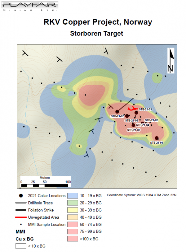 Results from the partially completed drill program at the Storboren High Copper MMI anomaly indicate the bedrock source of the copper is located upslope from the seven holes drilled in 2021. The immediate source of the part of the anomaly tested by drilling is interpreted as downslope migration of copper in overburden due to a combination of soil creep, sulphide weathering and local acid drainage. The drilling was carried out late in the year and the onset of snowy winter conditions coupled with the very steep terrain required the remaining drilling to be postponed to Spring 2022.