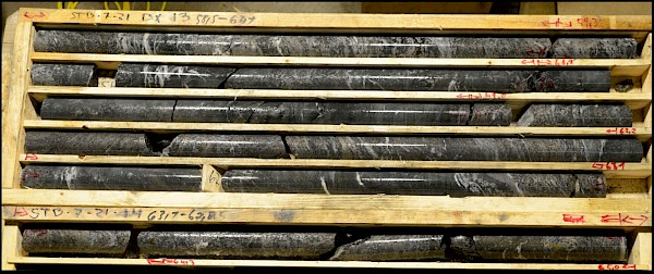 NQ core with sulphides in drillhole STB-21-007 at Storboren