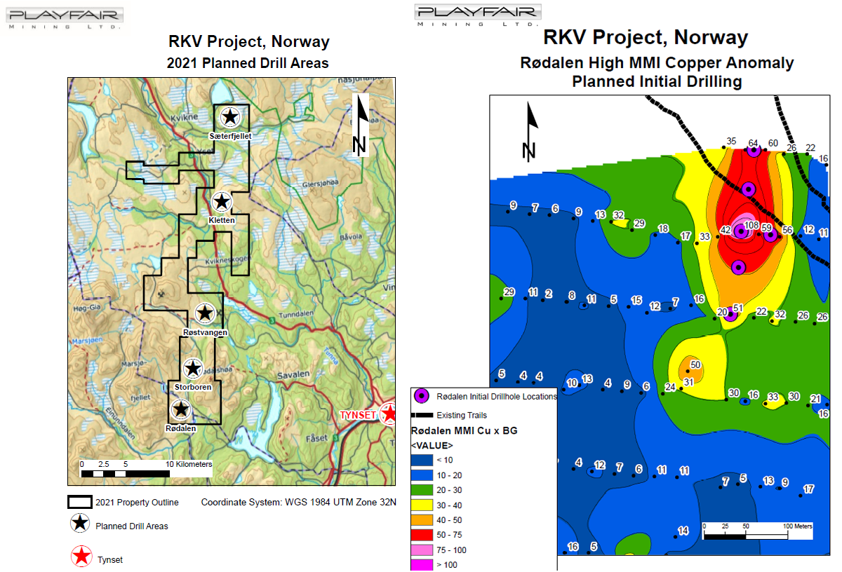 Playfair’s NQ core drilling program on its large (201 square kilometers) 100% owned RKV Copper Project in South Central Norway is in progress at the Rødalen high copper MMI anomaly, the first of seven drill targets delineated by Playfair in five areas. Drill Notifications have been made and approved for 38 initial drillholes and up to 122 additional holes dependent on results.