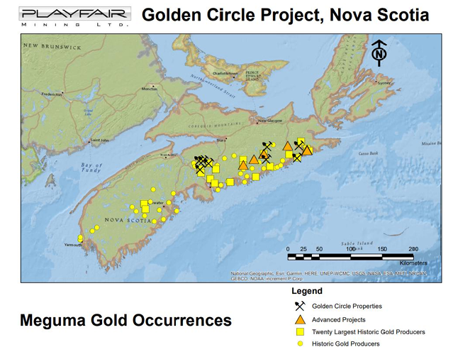 Playfair’s Golden Circle Project covers 76.47 sq km and 8 historical gold districts in Nova Scotia. Due diligence has been completed and Playfair has made the initial payment to ExplORE Resources. Playfair can purchase 100% of the Golden Circle project over 3 years for a total of $650,000 CAD ($130,000 CAD already paid) and an NSR Royalty.