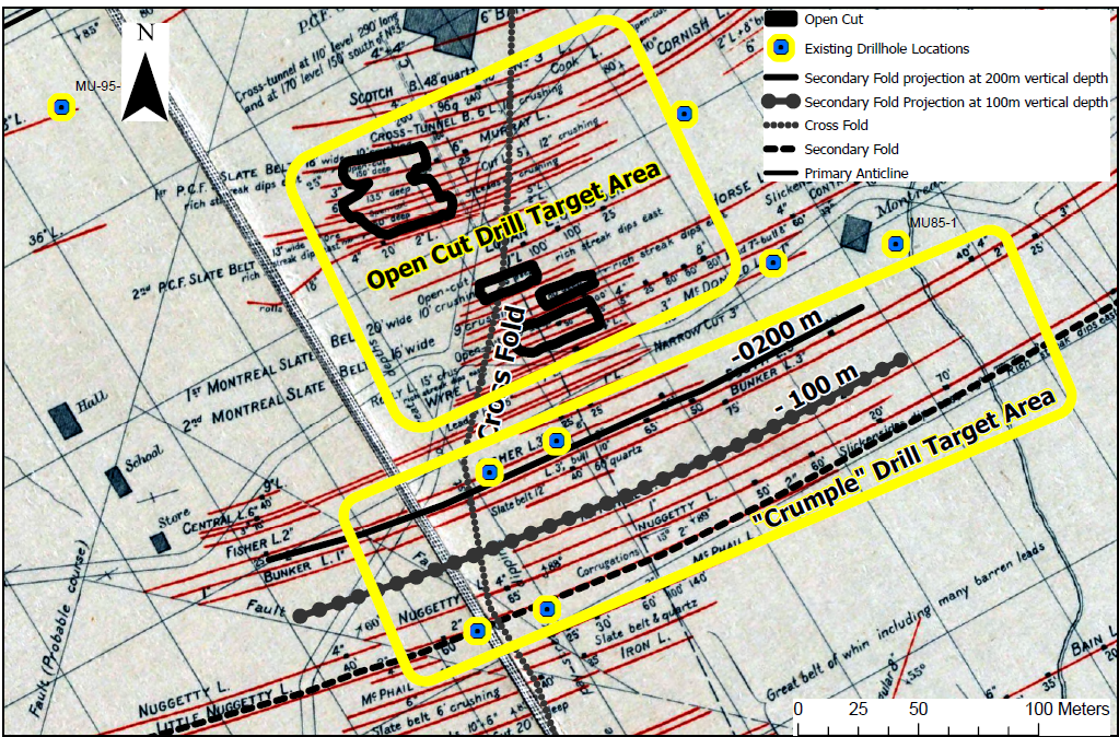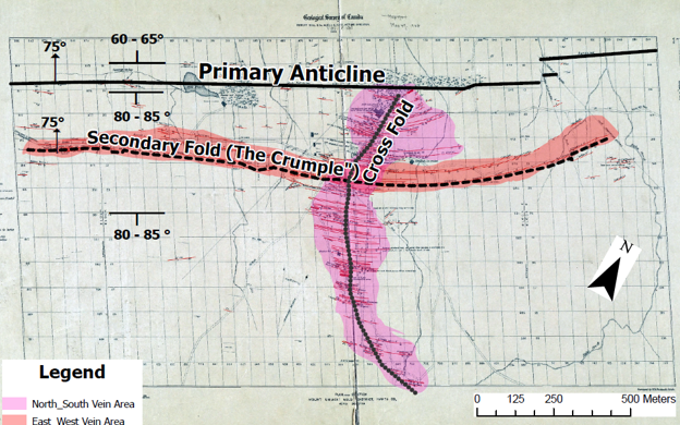 The gold-bearing veins of the northern part of the north-south vein area have not been tested at depth where “The Crumple” is projected to occur.
