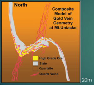 Gold-bearing quartz veins occur on the South flank of the Mount Uniacke Dome. The veins generally occur in the bedding, which is near vertical.