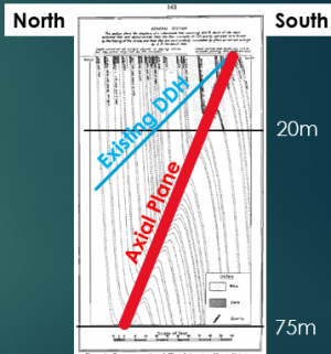 No existing drilling has tested “The Crumple” at depth. Two previous drillholes in 1974 were collared where the axial plane of “The Crumple” reaches surface. These holes were flatter than the fold axial plane so did not test the target.