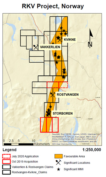 Playfair Mining’s 100% owned RKV copper-cobalt-nickel project currently encompasses 330 square kilometers in a historic mining area about 100 km south of Trondheim by road. Two historic copper mines, Kvikne and Rostvangen, a drilled nickel-copper deposit, Vakkerlien, and over 20 known mineral occurrences mapped and sampled by the Norwegian Geological Survey (NGU) together with an extensive digital database formed the initial impetus for exploration in the area.
