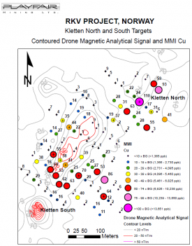 In the central part of the RKV Project, Playfair has discovered two significant MMI Cu anomalies at Kletten, as shown on the detailed map.