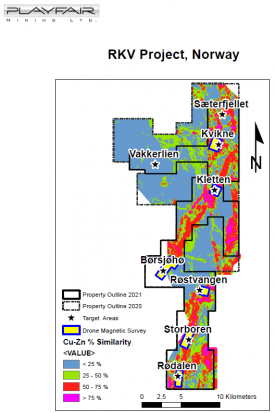 Playfair Mining Ltd., using modern technology to explore its 100% owned RKV Project in a large historic mining area in south-central Norway, has identified eight Target Areas under consideration for 2021 drilling programs. The first two targets identified, Storboren (November 07, 2020 and December 05, 2020 News Releases) and the second, Sæterfjellet, (News Release January 06, 2021) were reported by Playfair. The recently defined targets at Kletten North and Kletten South are described here.