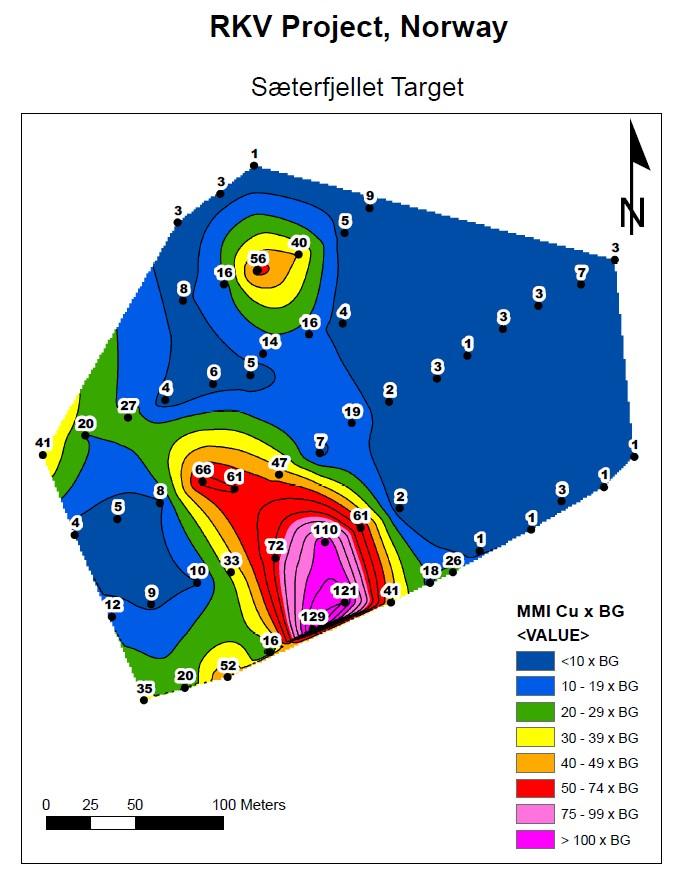 At Sæterfjellet, in the northern part of the RKV Project, Playfair has discovered a coherent MMI Cu anomaly as shown on the detailed map. The anomaly is open to the southeast and contains 7 values of MMI Cu greater than 50 times background in an area 125 metres long by 50 metres wide. The widest and strongest part of the anomaly is on the most southeasterly line and the anomaly limit has not yet been defined.