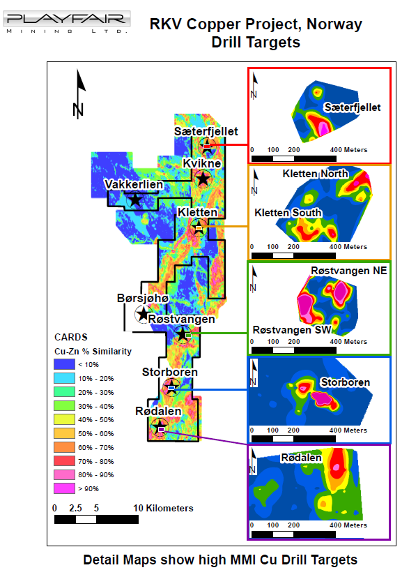 Playfair is planning a core drilling program on its large (201 square kilometers) 100% owned RKV Copper Project in South Central Norway. Playfair has delineated seven drill targets and has filed Drill Notifications with the Norwegian Directorate of Mining (six are approved to date).